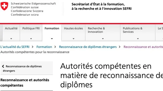 Description : “In Switzerland, there are various authorities responsible for recognising foreign qualifications. The one to contact depends on your professional title. Detailed information on the recognition procedure can be obtained directly from the recognition authority in charge of your professional activity.”